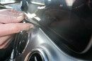 1. Använd den medsända våtservetten till att rengöra området där ProClip-fästet ska monteras. Avlägsna skyddsplasten på de dubbelhäftande tejpremsorna på ProClip-fästet. Haka fast fästets vinklade nederdel under ramen som omger panelen runt luftgallren och instrumentbrädans nedre sektion.