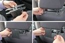 Fästet placeras på framsätets nackstöd. Du kan montera det själv på ett par minuter, monteringsanvisning medföljer.