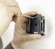 1. Anpassa hållaren efter din enhet: Lossa på skruvarna på hållarens framsida så att hållarens sidor kan justeras. Placera enheten i hållaren. Pressa ihop hållarens sidor så att enheten sitter stadigt på plats. Skruva åt skruvarna på hållarens framsida
