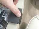 2. Pressa in fästets vikta vänsterdel i springan intill springöppnaren. Pressa fästet åt höger/nedåt så att den vikta vänsterdelen hakar fast under panelen som omger växelspaken.