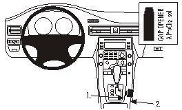 1. Använd den medsända våtservetten till att rengöra området där ProClip-fästet skall placeras. Pressa in den medsända springöppnaren mellan panelen som omger växelspaken och konsolen för att vidga springan. Avlägsna skyddsplasten på de dubbelhäftande tejpremsorna på fästet.