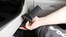 2. Använd den medsända våtservetten till att rengöra området där fästet ska monteras. Avlägsna skyddsplasten på den dubbelhäftande tejpen. Haka fast fästets vinklade nederdel under mittkonsolens sidovägg.