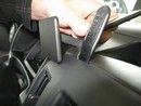 3. Pressa in springöppnaren mellan myntfacket och instrumentbrädan. Pressa fästets överdel framåt/nedåt så att den vinklade kanten hakar fast i springan intill springöppnaren. Avlägsna springöppnaren. Pressa framåt på fästets överdel så att den vinklade kanten går helt i springan.