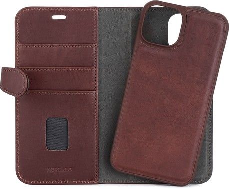 Mobilfodralet i läder av hög kvalitet för iPhone 14 har tre kortplatser & sedelficka. Det skyddande magnetskalet kan användas separat.