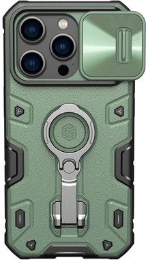 Nillkin CamShield Armor Pro för iPhone 14 Pro Max är ett extra tåligt skal som har ett inbyggt kickstand. Kickstandet är en ring som kan roteras 360°.