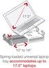 Detta No-Drill Laptop Stand System installeras snabbt och enkelt i de specificerade fordonen med hjälp av den befintliga hårdvaran på passagerarsidans sätesskenor. Denna konfiguration ger en teleskopfunktion som sträcker sig från 12 till 18 tum. Dubbla svängarmar ger artikulation och 12 tums räckvidd för passagerare och förare åtkomst till den monterade enheten. Patenterad gummikula och hylsa ger ytterligare justering samt stöt- och vibrationsisolering. RAM Tough-Tray är fjäderbelastad för att rymma 10" till 16" breda bärbara datorer (17" breda skärmar). Brickan har fyra justerbara fästarmar med gummigrepp. Dessa armar kan flyttas både vertikalt och horisontellt. Detta möjliggör en anpassad passform för olika tjocklekar av bärbara datorer och friheten att inte blockera portar eller enheter. Ett skärmstöd och USB-lampa finns också tillgängliga för att tillbehöra brickan. Hålmönster på omkretsen av brickan underlättar monteringen av ytterligare RAM-system för att stödja GPS eller annan elektronik .