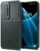 Spigen Optik Armor är ett hårt skal med integrerat kameraskydd. Kameraskyddet kan du dra för linserna när du inte använder din Samsung Galaxy S24 för extra skydd och sekretess.